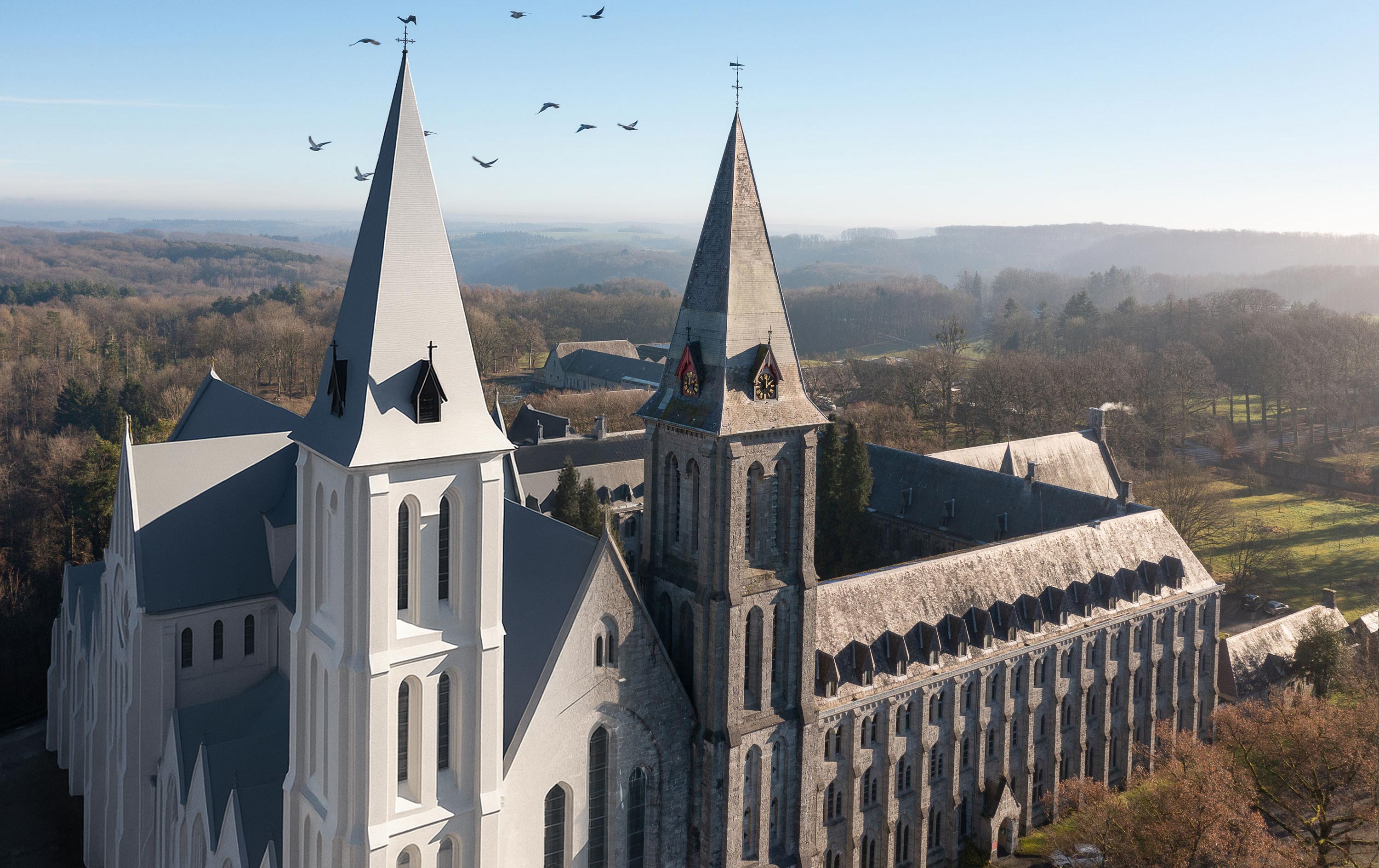 Longue de 72 mètres pour une largeur de 28 mètres et une hauteur de façade de 35 mètres, dont les tours culminent à 59 mètres, la basilique de Maredsous comptabilise 3500 m2 de toitures, des ardoises vieilles de près de 150 ans ! Les corniches et descentes d’eau pluviales sont à bout de souffle… Les différents éléments en zinc et en plomb qui assurent la jointure entre les divers volumes et matériaux – pierre, ardoise, zinc – doivent être remplacés.